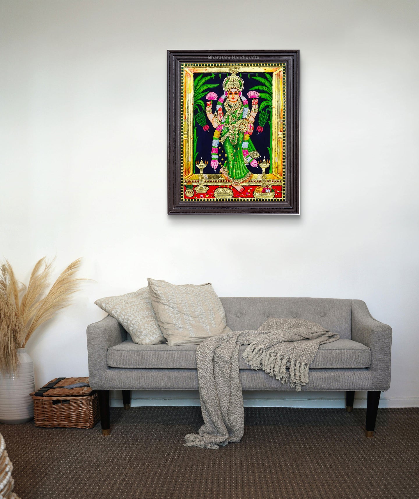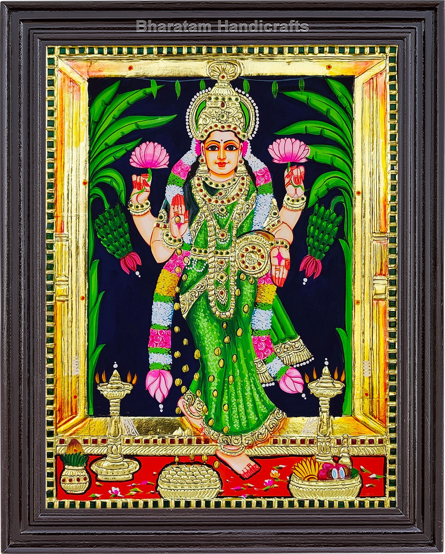 Experience the cultural and spiritual tradition of India with the Grahalakshmi Tanjore Painting  Handcrafted by skilled traditional artists, this painting brings auspiciousness and beauty to any home.