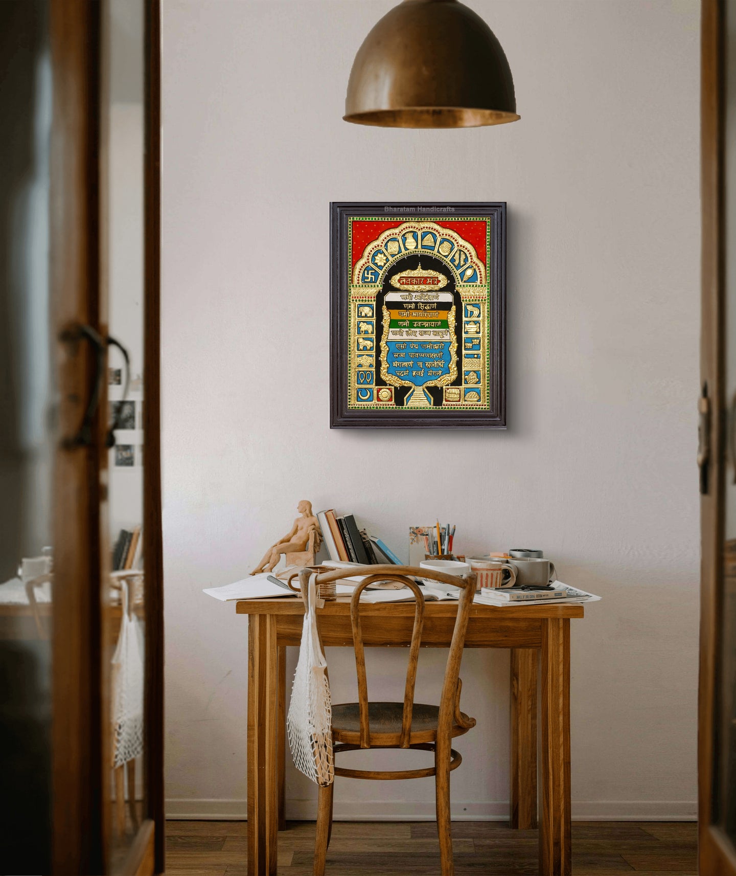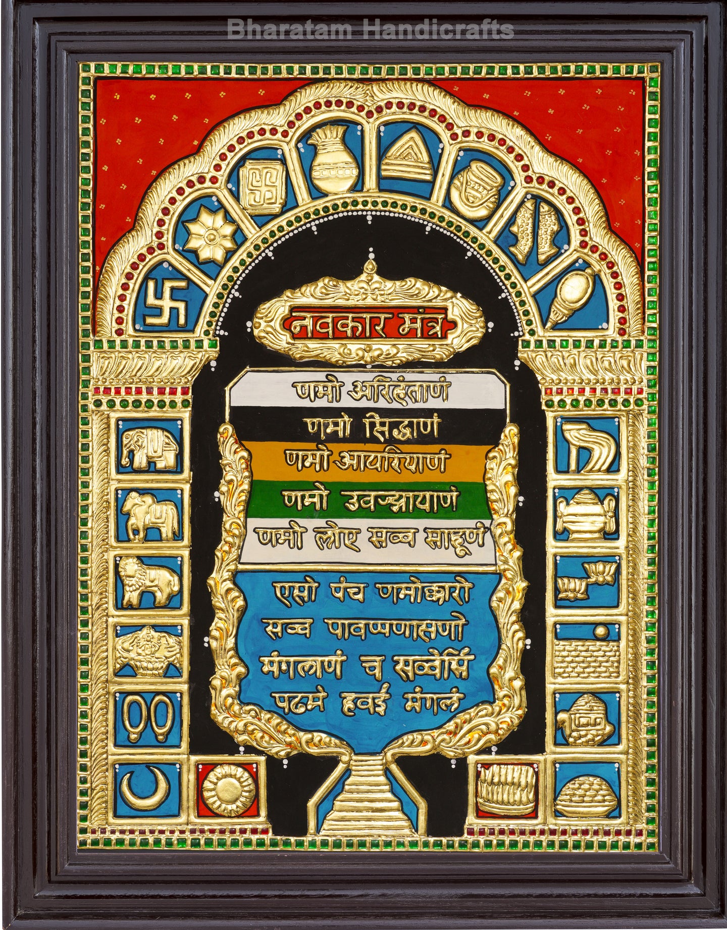 Experience the cultural and spiritual tradition of India with the Shri Navkar Mantra Tanjore Painting. Handcrafted by skilled traditional artists, this painting brings auspiciousness and beauty to any home.