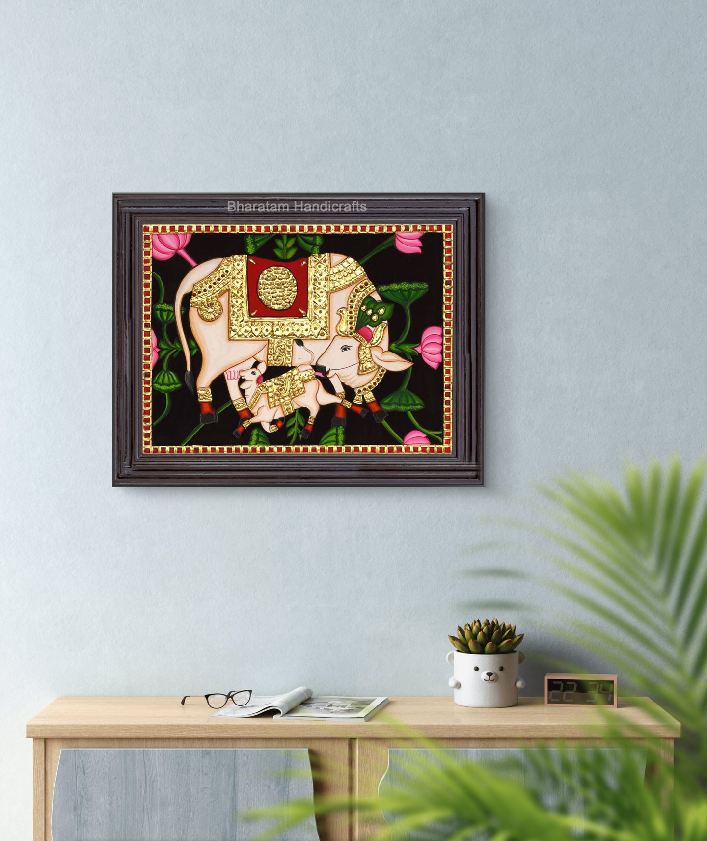 "Komatha" refers to a specific style of Tanjore painting that focuses on the depiction of a cow, often symbolizing abundance and fertility in Indian culture. The cow is considered sacred in Hinduism, and these paintings typically highlight its importance in various contexts, including rural life and spirituality.​