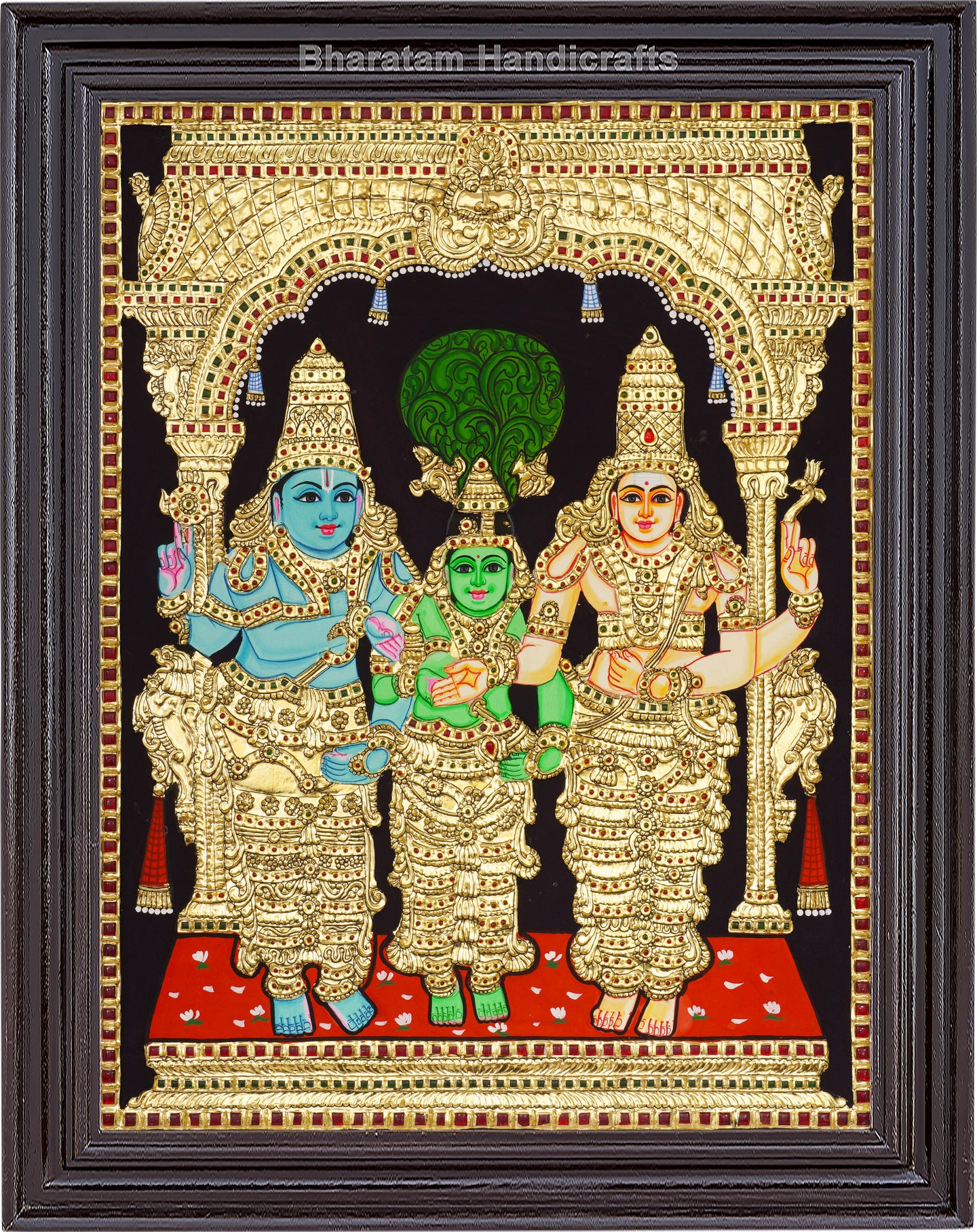 Experience the cultural and spiritual tradition of India with the Meenakshi Thirukalyanam Tanjore Painting  Handcrafted by skilled traditional artists, this painting brings auspiciousness and beauty to any home.