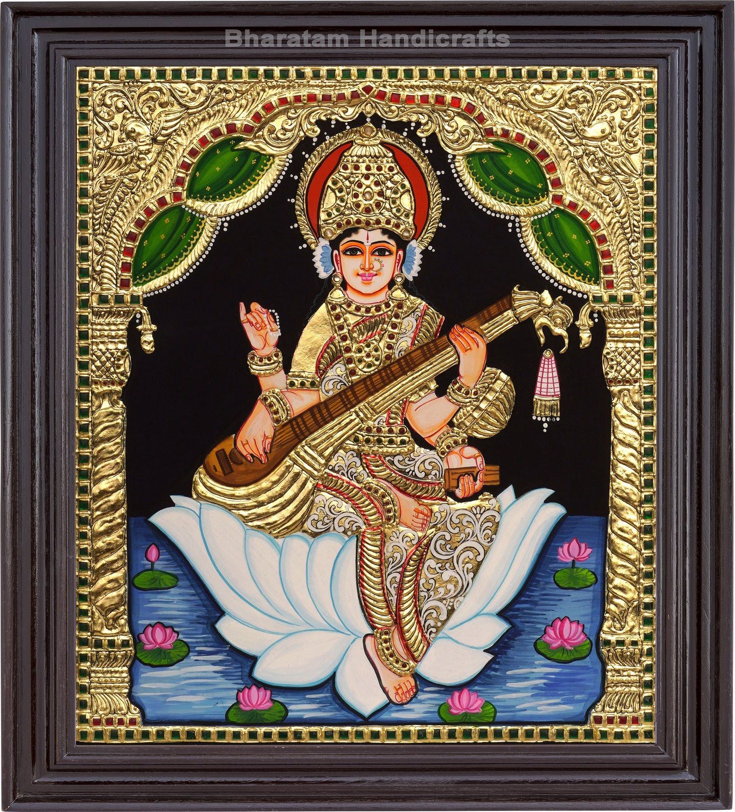Experience the cultural and spiritual tradition of India with the Saraswathi  Tanjore Painting. Handcrafted by skilled traditional artists, this painting brings auspiciousness and beauty to any home.
