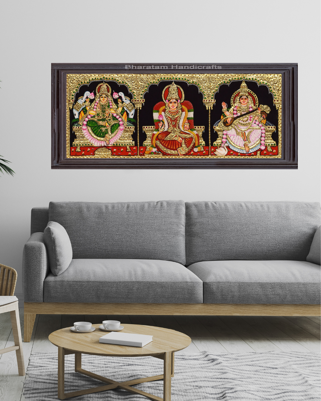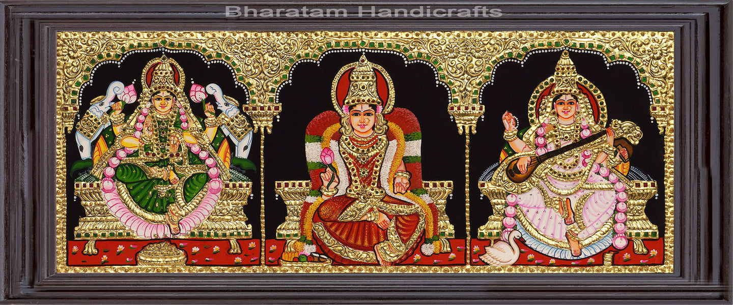 A three-panel Tanjore painting is a traditional Indian art form originating from Tamil Nadu, known for its rich colors, intricate designs, and the use of gold leaf. This type of painting typically features a central image flanked by two side panels, often depicting deities or scenes from Hindu mythology.